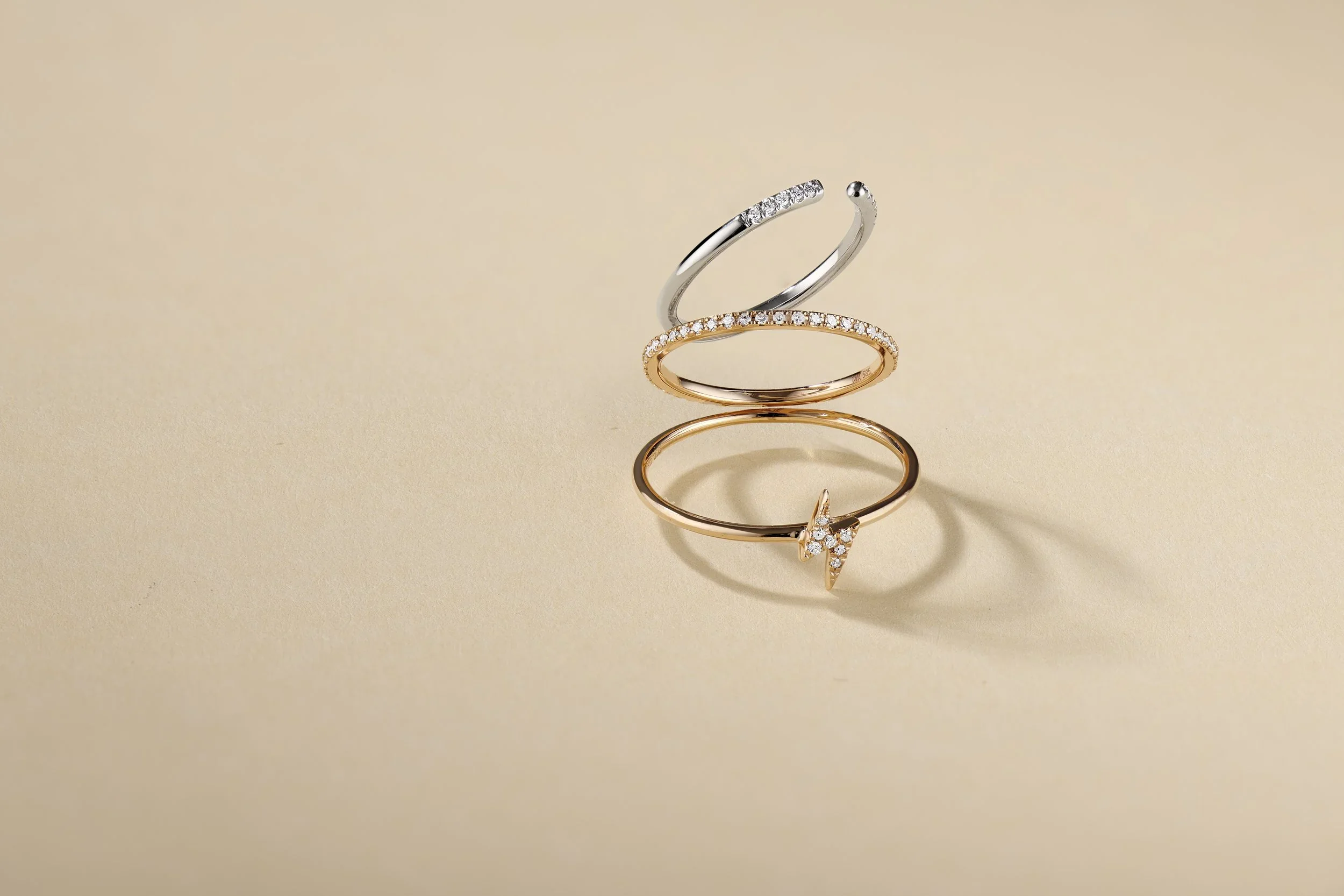 Stack of elegant gold rings with various designs, including one encrusted with diamonds, against a gold background.