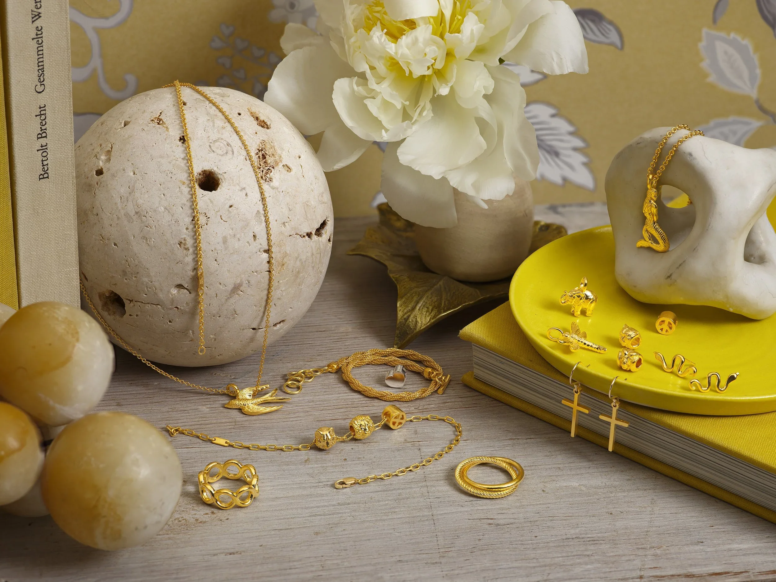Gold jewelry, including necklaces with coin pendants and a bracelet, displayed on smooth stones and a vase with a hand holding one necklace on a dark background.